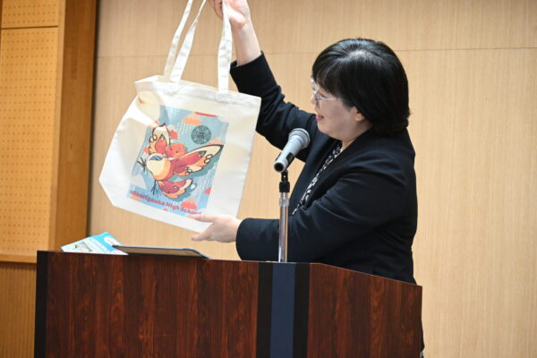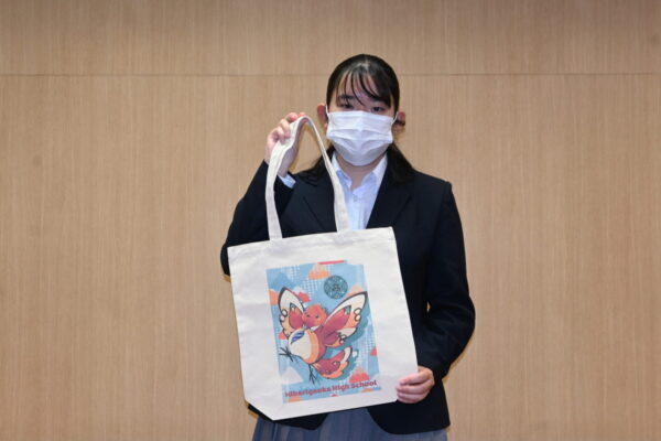 また、校長先生から「ひば吉デザインのトートバッグ」が披露されました!